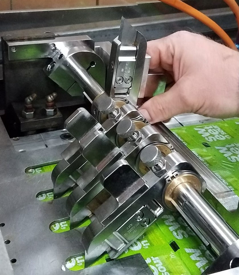A customer approached us following a serious injury sustained during blade replacement on their existing slitter knife assembly. The OEM unit required removing bolts and rotating up an assembly that exposed four sharp blades at once. To change a blade, operators had to reach across the exposed knives with a wrench — a risky process that led to a major injury and downtime.